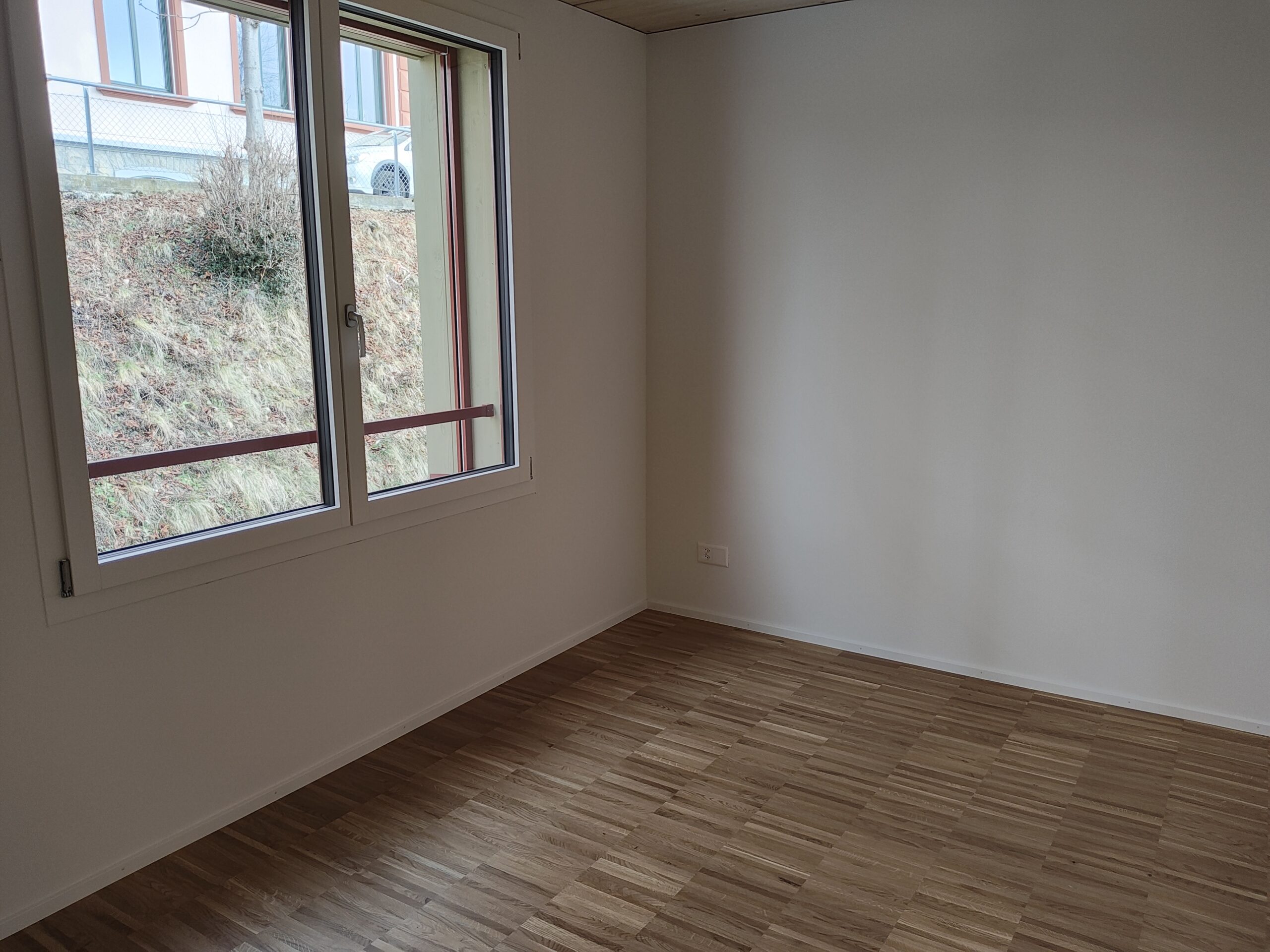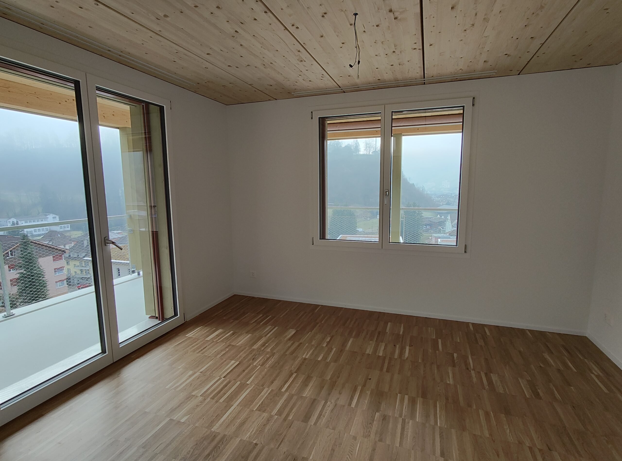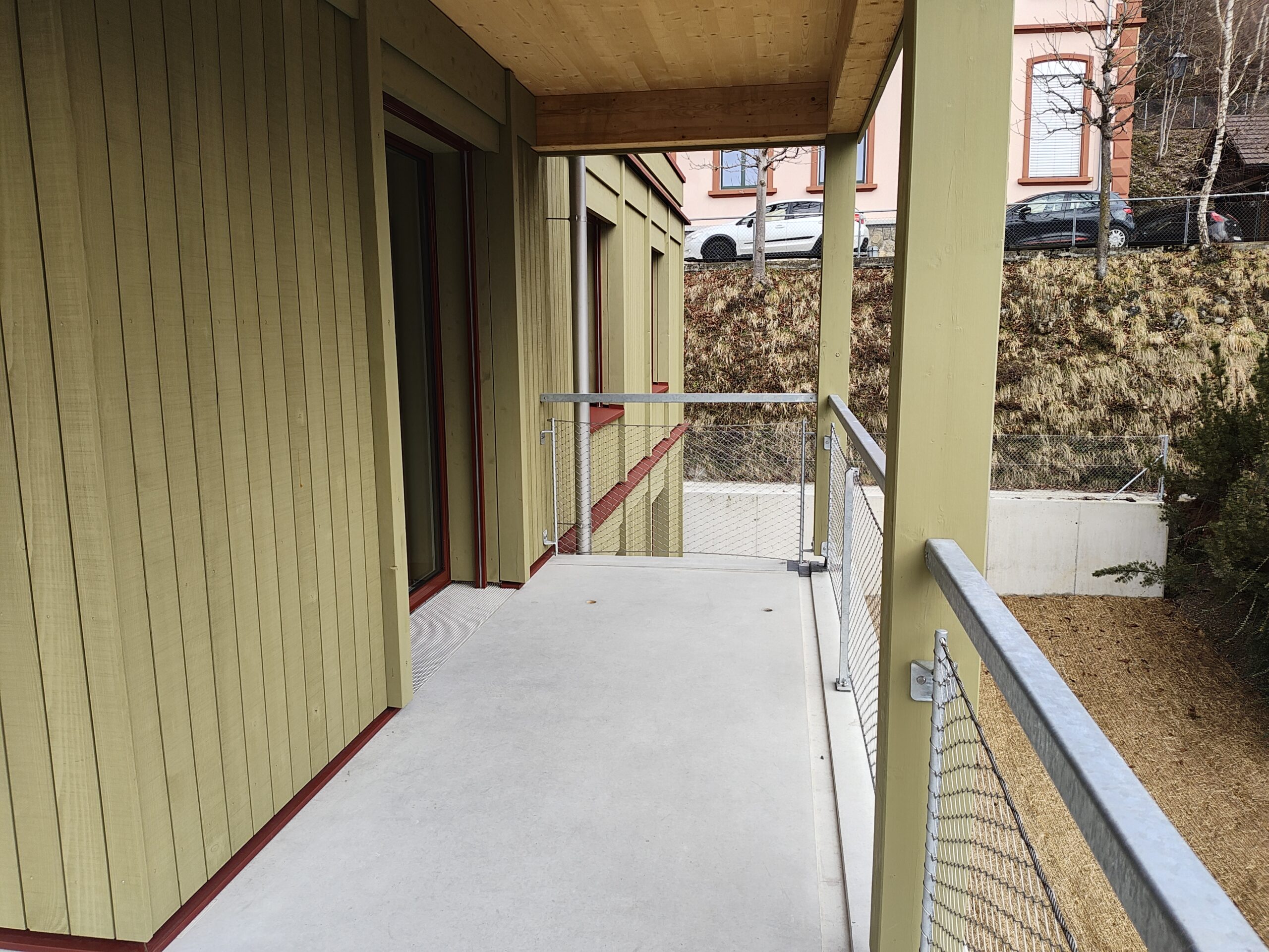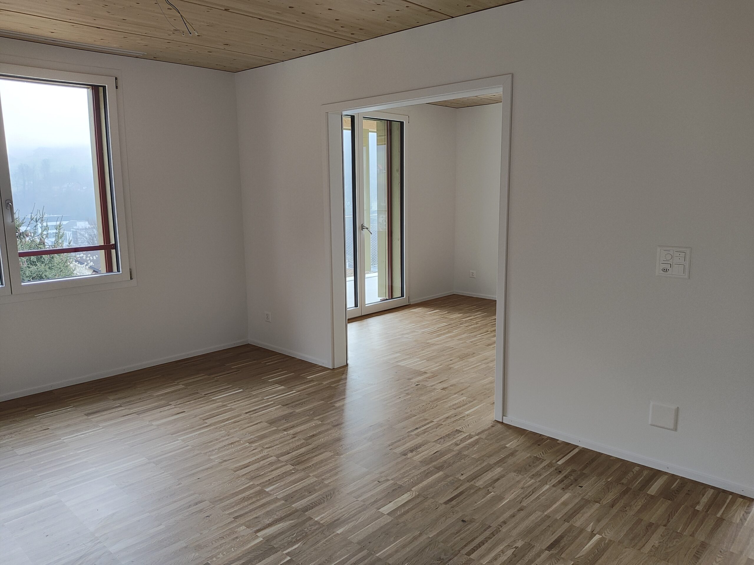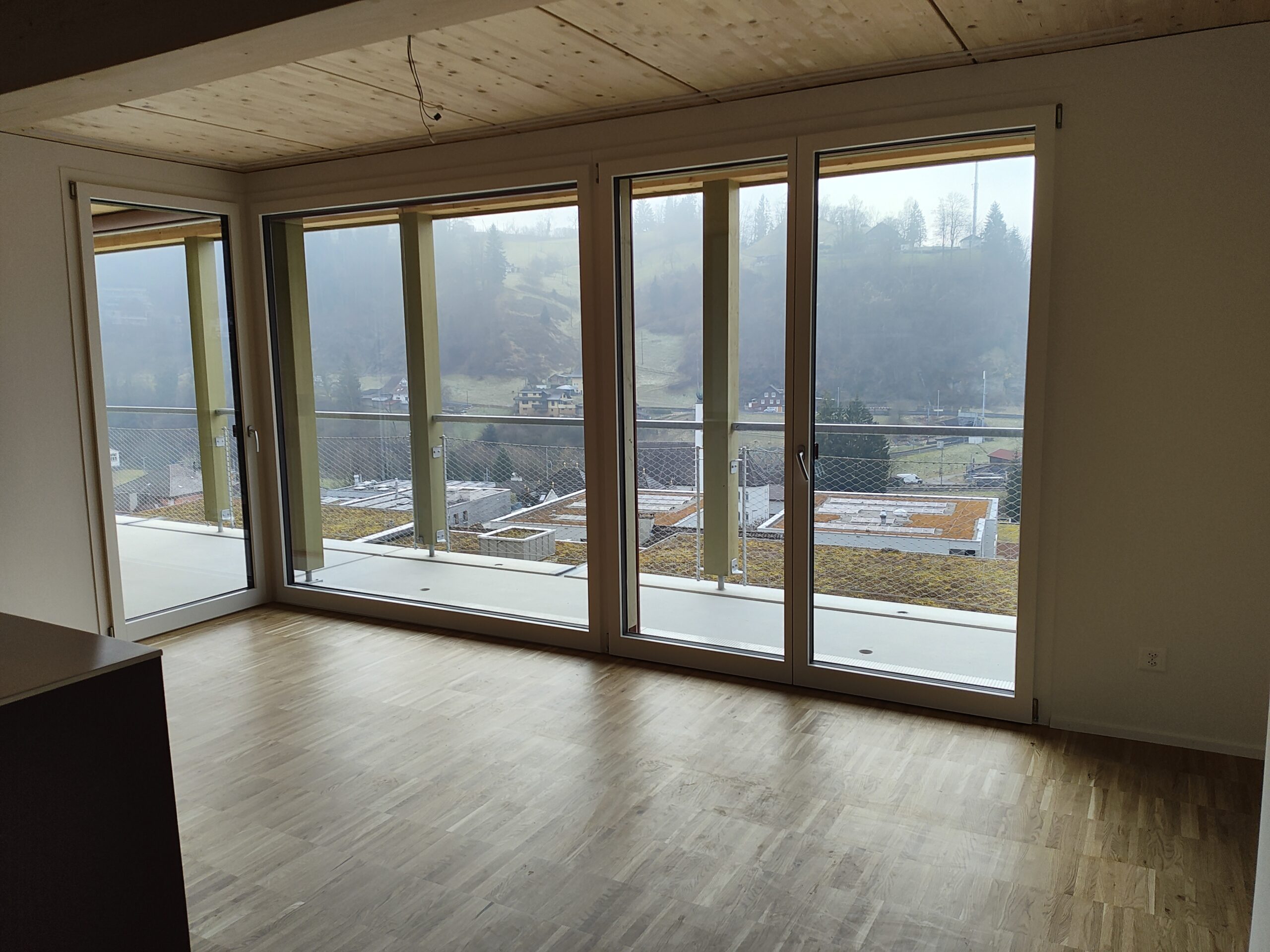 neue sonnige 5.5-Zimmerwohnung mit guter Aussicht, umlaufendem Balkon, Holzbau, Wasch/Trockner-Kombination, Glasfaser, Wärmepumpe, Nähe Kirche